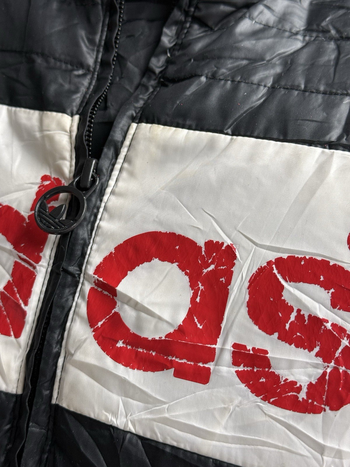 Adidas Retro Firebird Black with White and Red Trim Full Zip Through Down Insulated Puffer Jacket, Size Medium, Pockets, Printed Big Spell Out Logo, Embroidered Logo