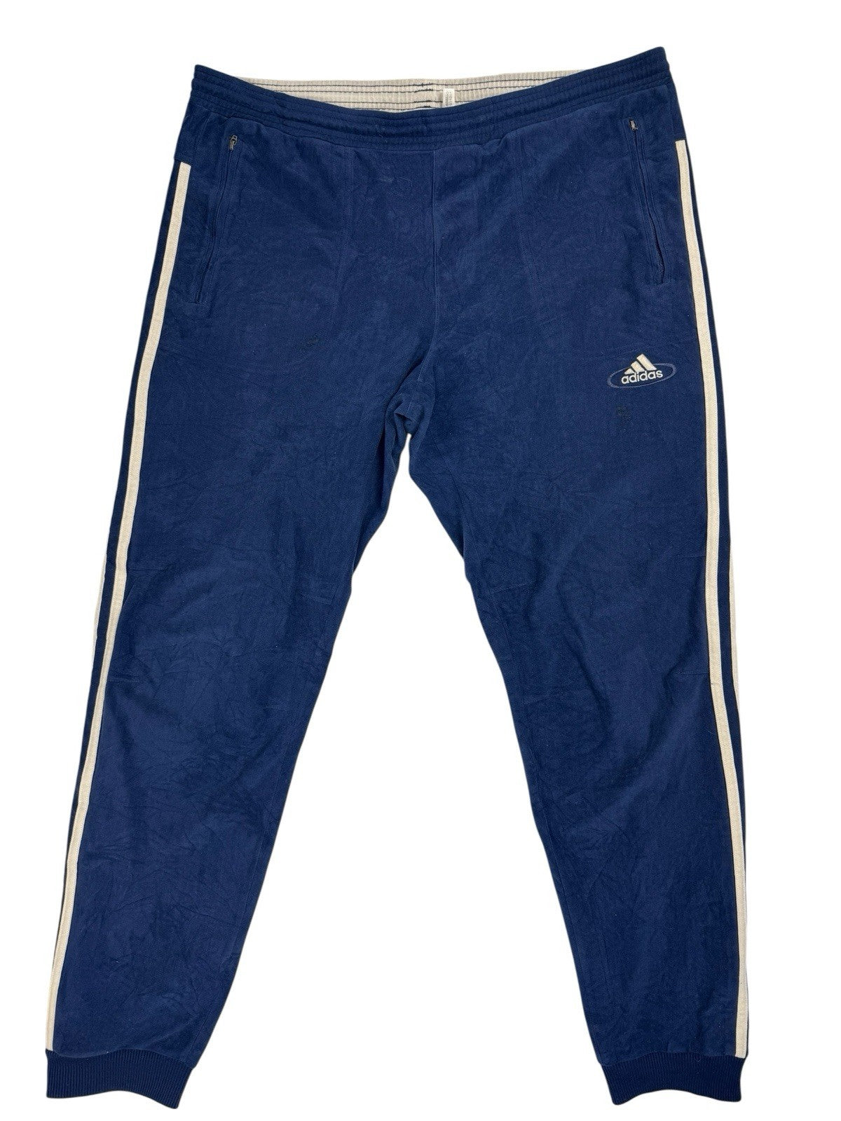 Vintage 90's Y2K Adidas Blue Velour Polyester Tracksuit Bottoms Joggers, Size 38-40, Zipped Pockets, Contrast Striped Trim, Embroidered Retro Badge, Drawstring Waist, Adjustable Zipped Ankles, Circa '99