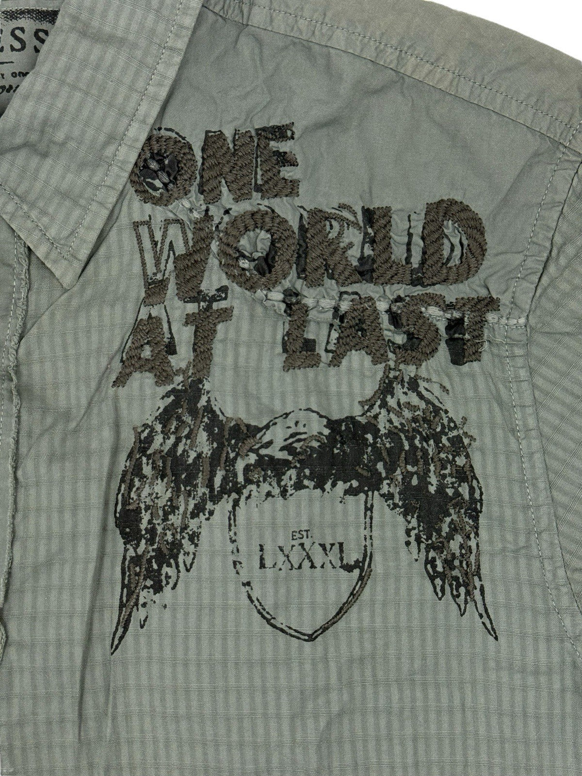 GUESS Retro Y2K 00's Olive Green Short Sleeve Collared Button Up Shirt Size Large, Snap Closure, Embroidered 'One World At Last' Design, Subtle Check Pattern