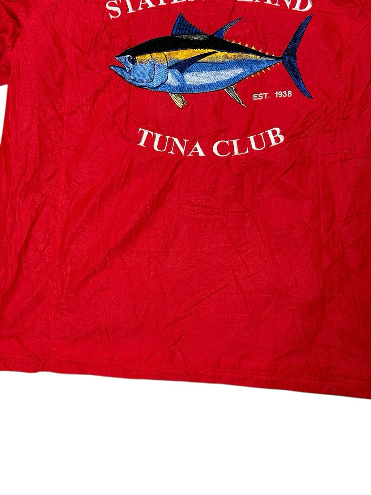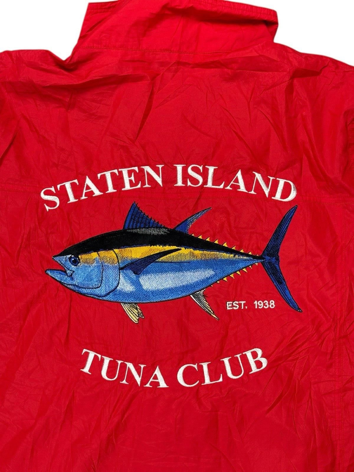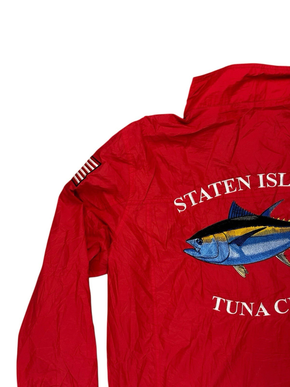 L.L. Bean Red Full Zip Through Polyester Jacket, Size Large Regular Fit, Zipped Pockets, Mesh Lining, Adjustable Drawstring Waist, Large Staten Island Tuna Club Logo, American Flag, and John Embroidered Logos, Unique Americana Streetwear