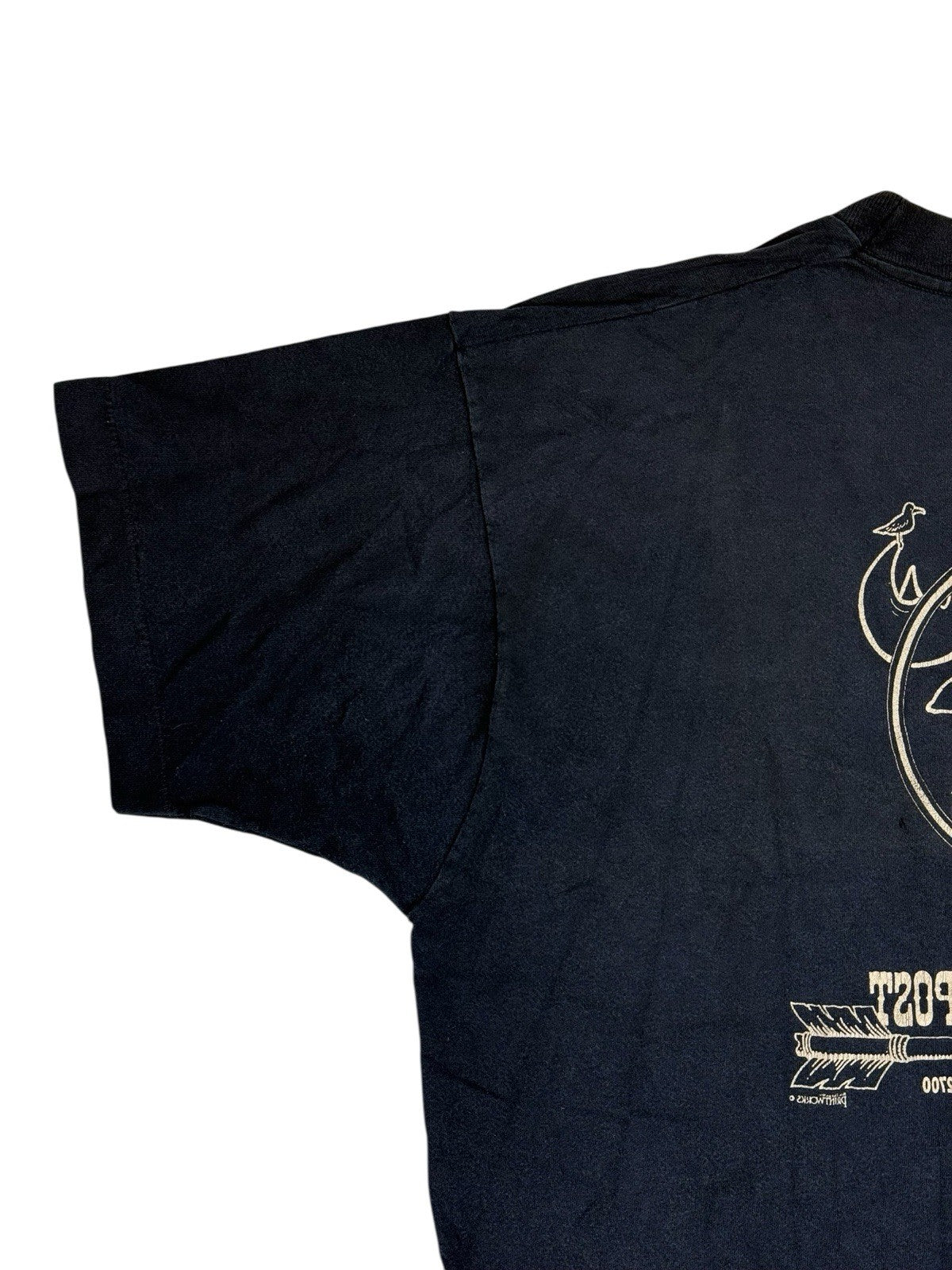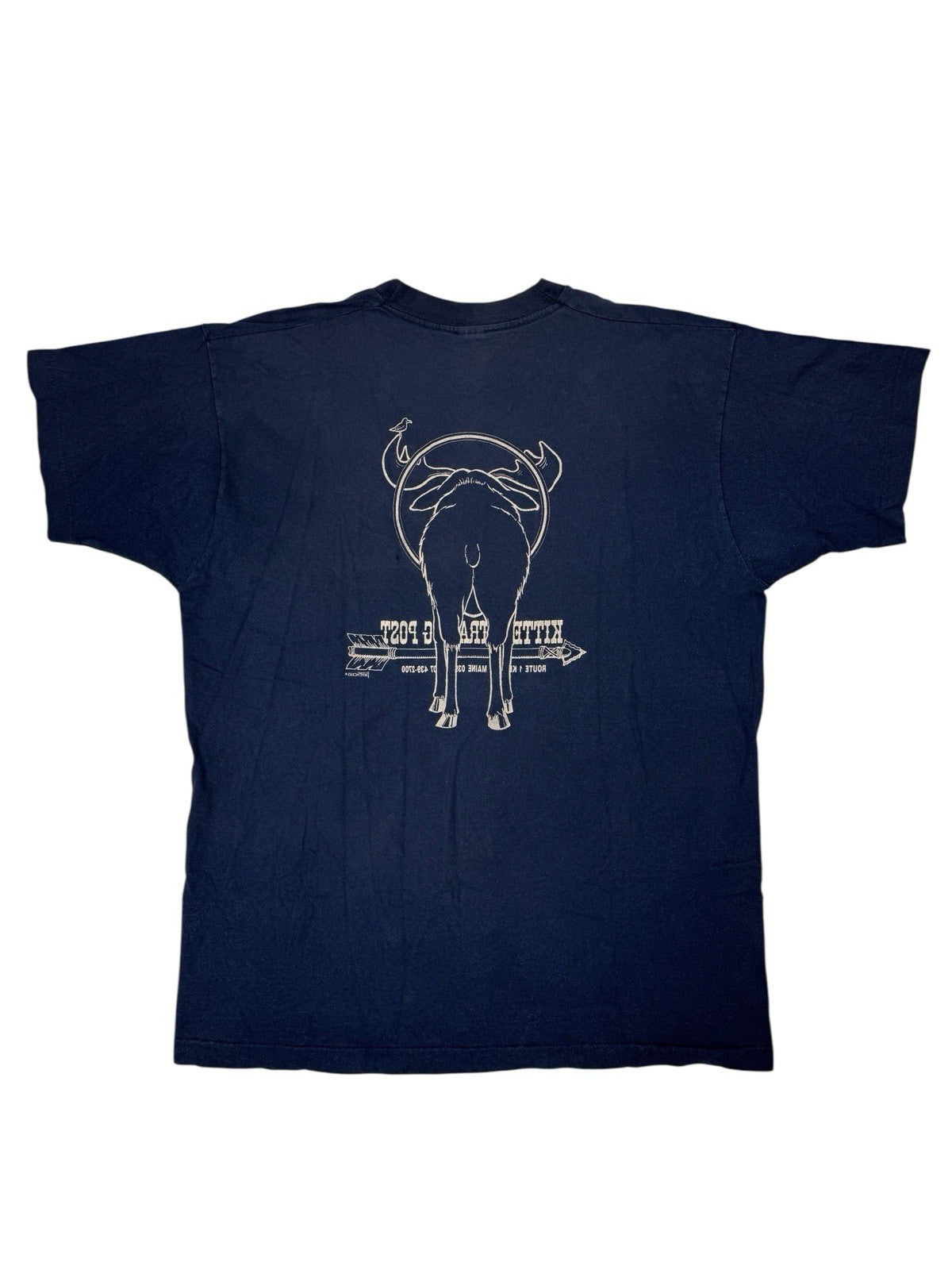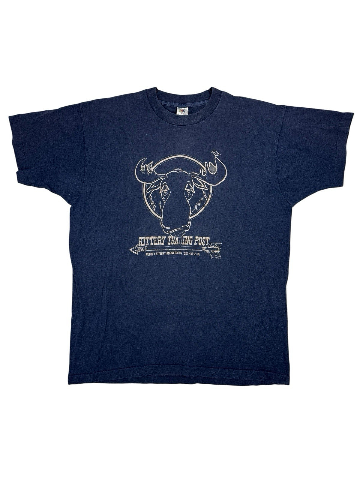 Vintage Fruit of the Loom Blue Kittery Trading Post Mane, USA Big Funny Graphic Printed T-Shirt Size XL, Front and Back Print, Single Stitch, Circa 90's, Retro Novelty Unique Americana Clothing