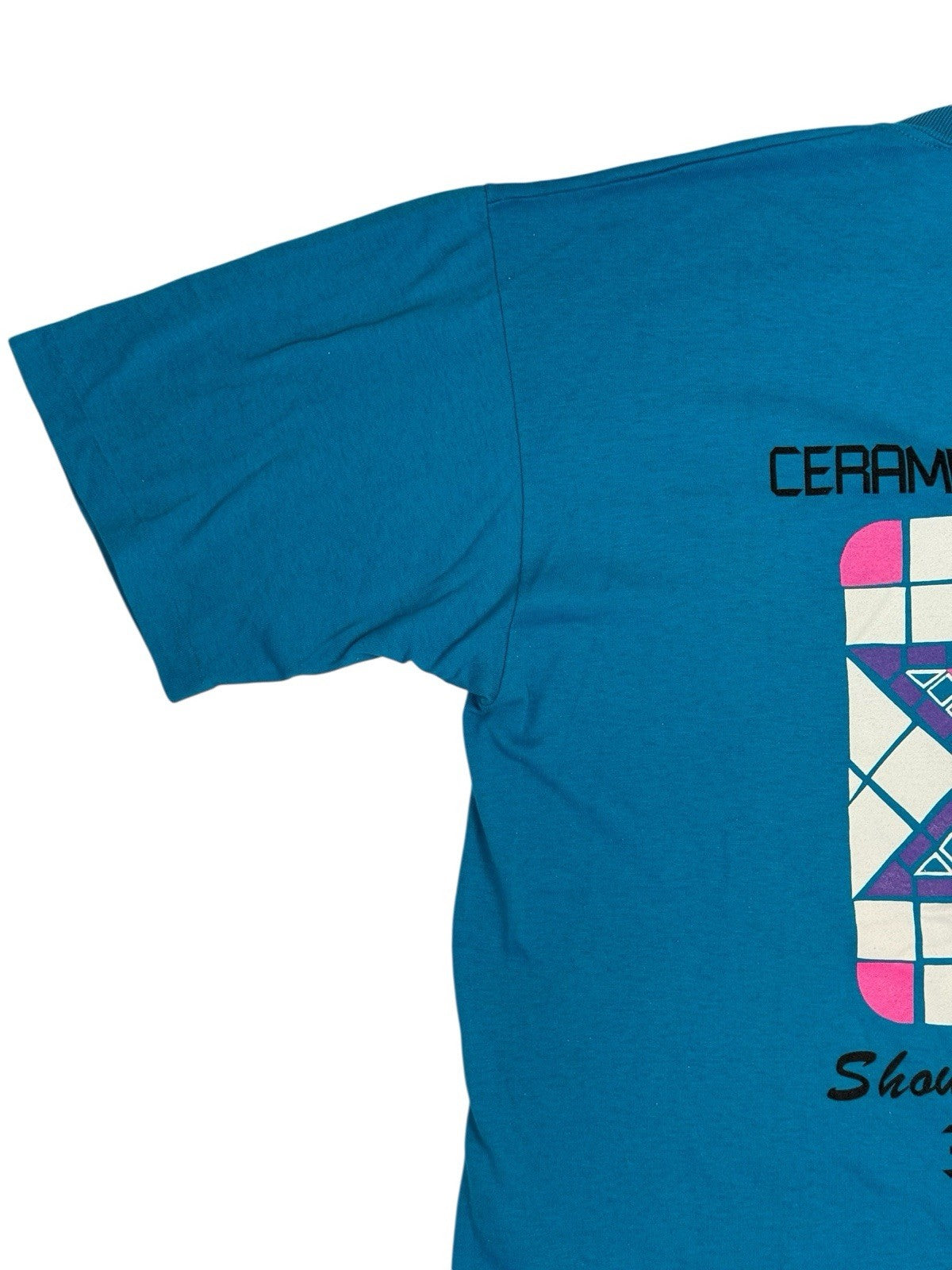 Vintage Jerzees Blue/Teal Cotton/Poly Blend Geometric Trippy Graphic Print T-Shirt, Size XL, Ceramic Tile Sales, 90's USA Random Funny Clothing, Made in USA