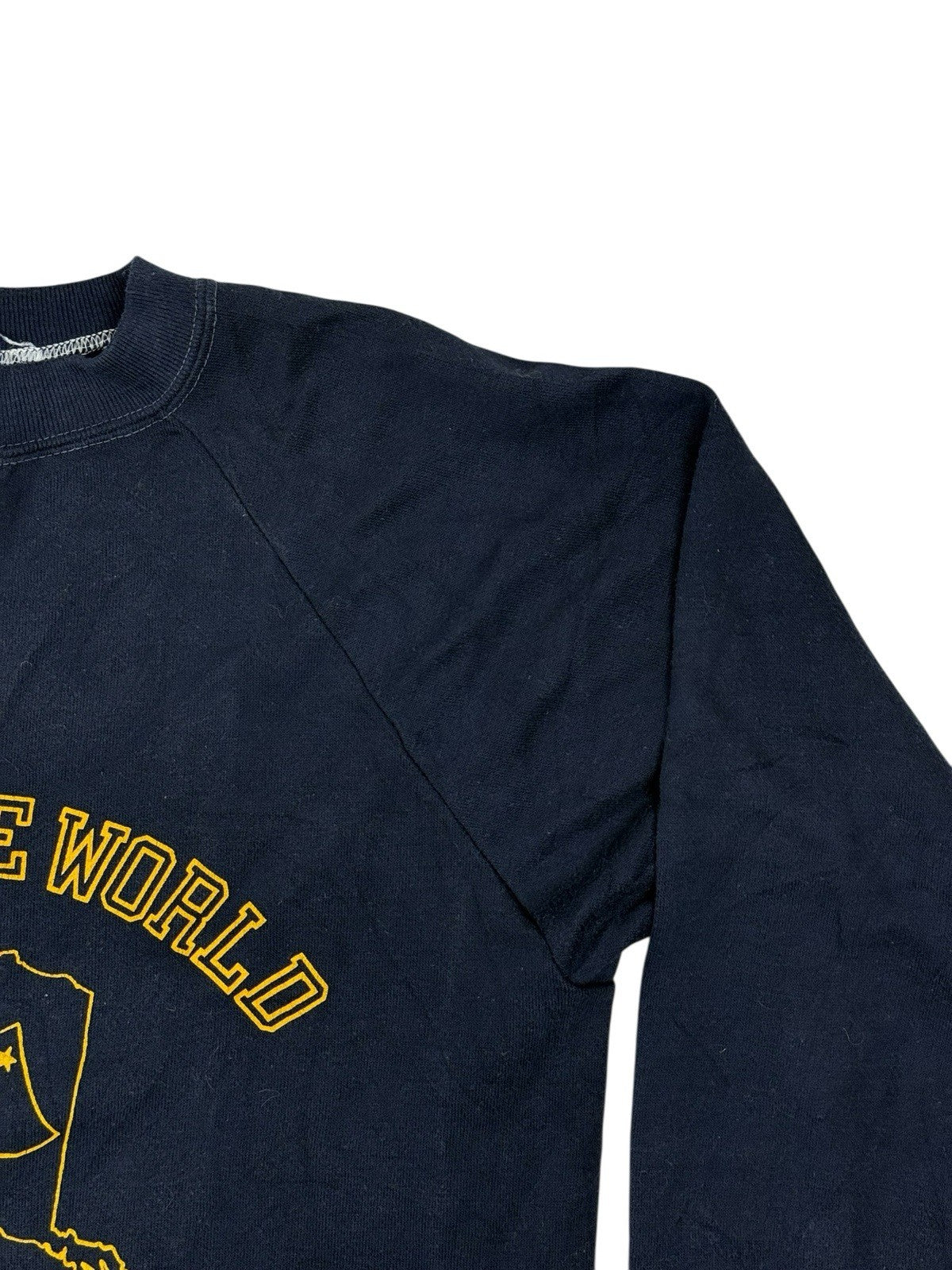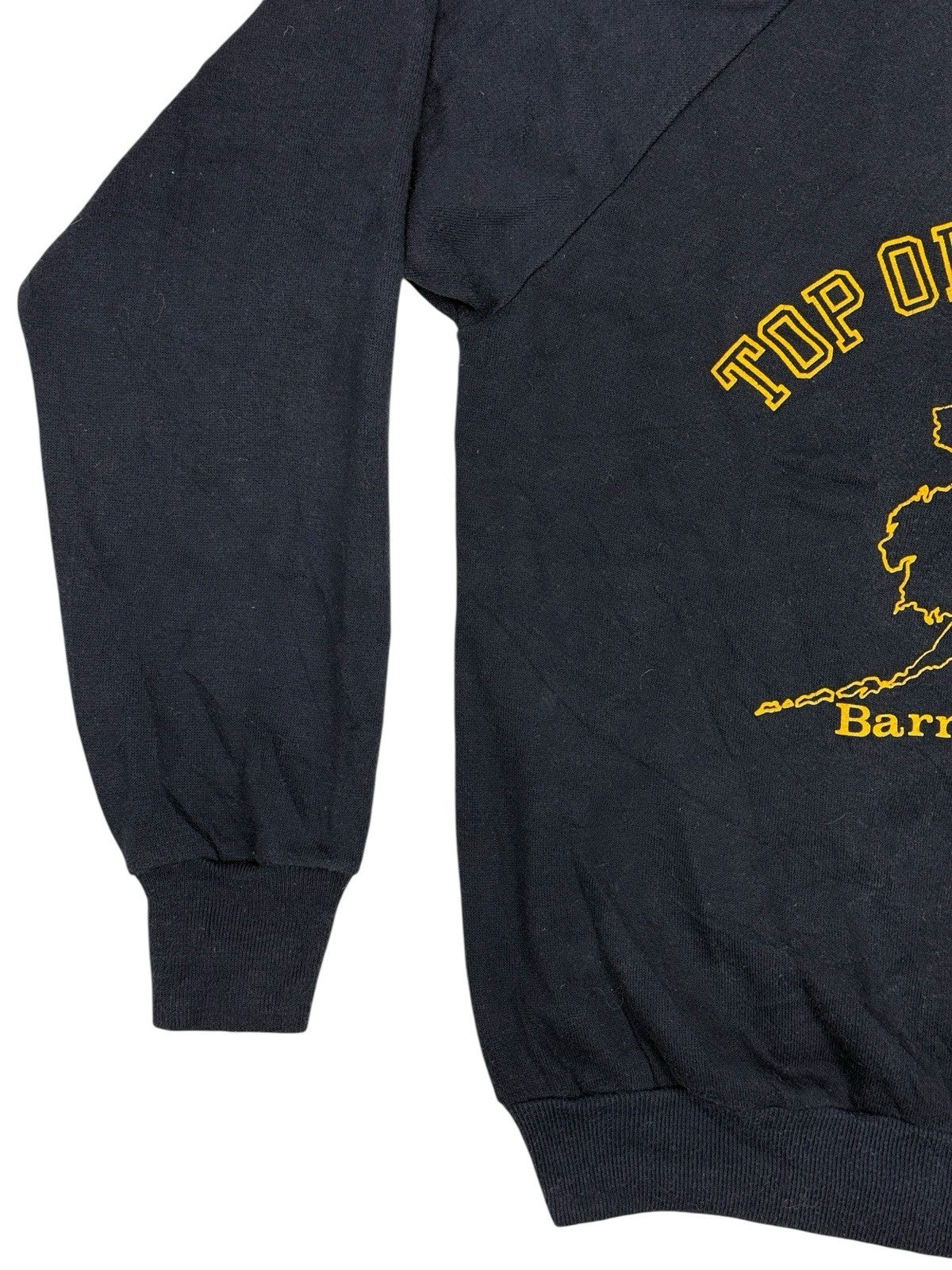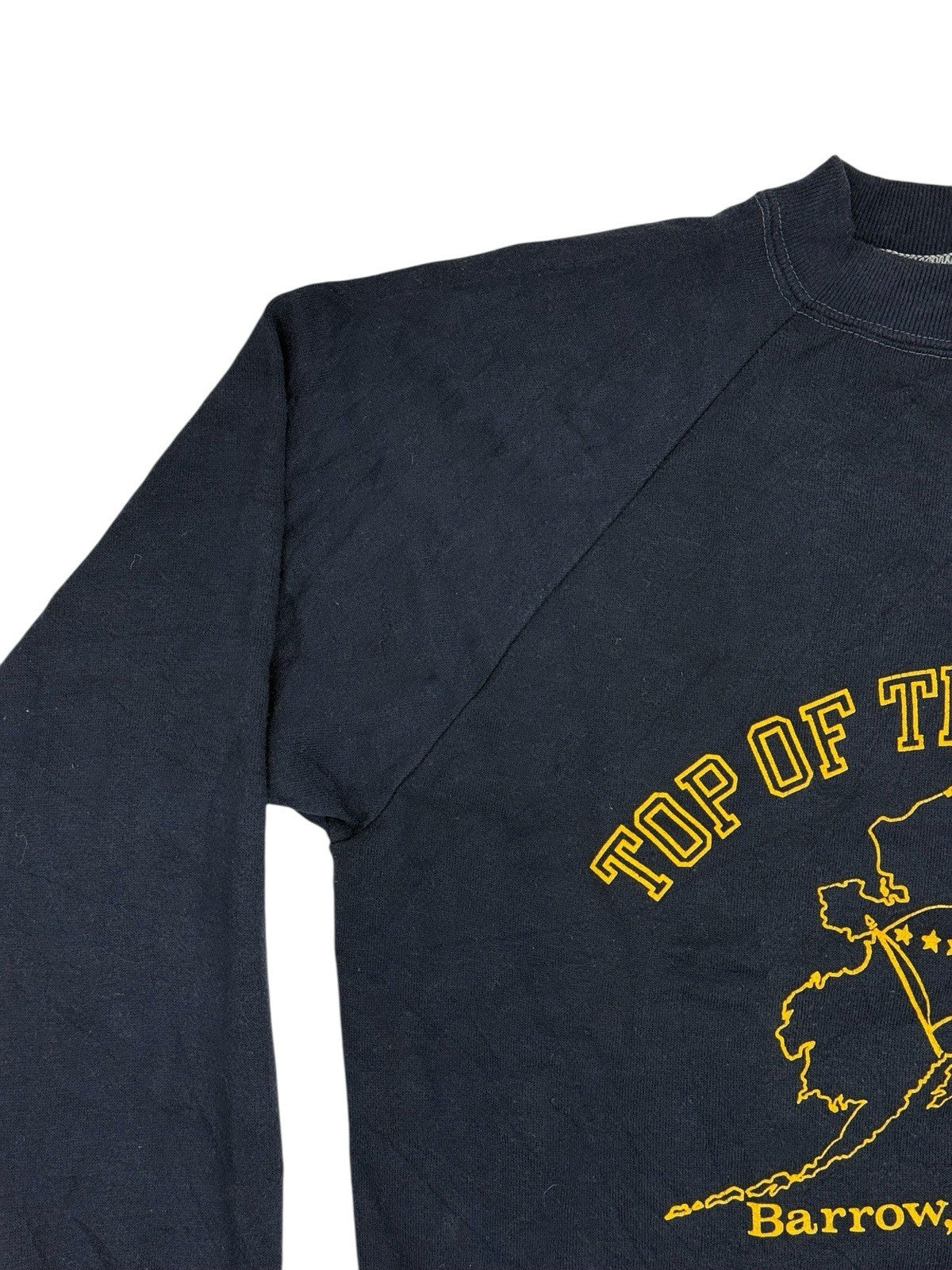 Unbranded Vintage Americana Blue Sweater Jumper Pullover With Yellow Printed 'Top of The World Barrow, Alaska' Graphic. Soft Fleece Lining. No tag so please check measurements for size guide
