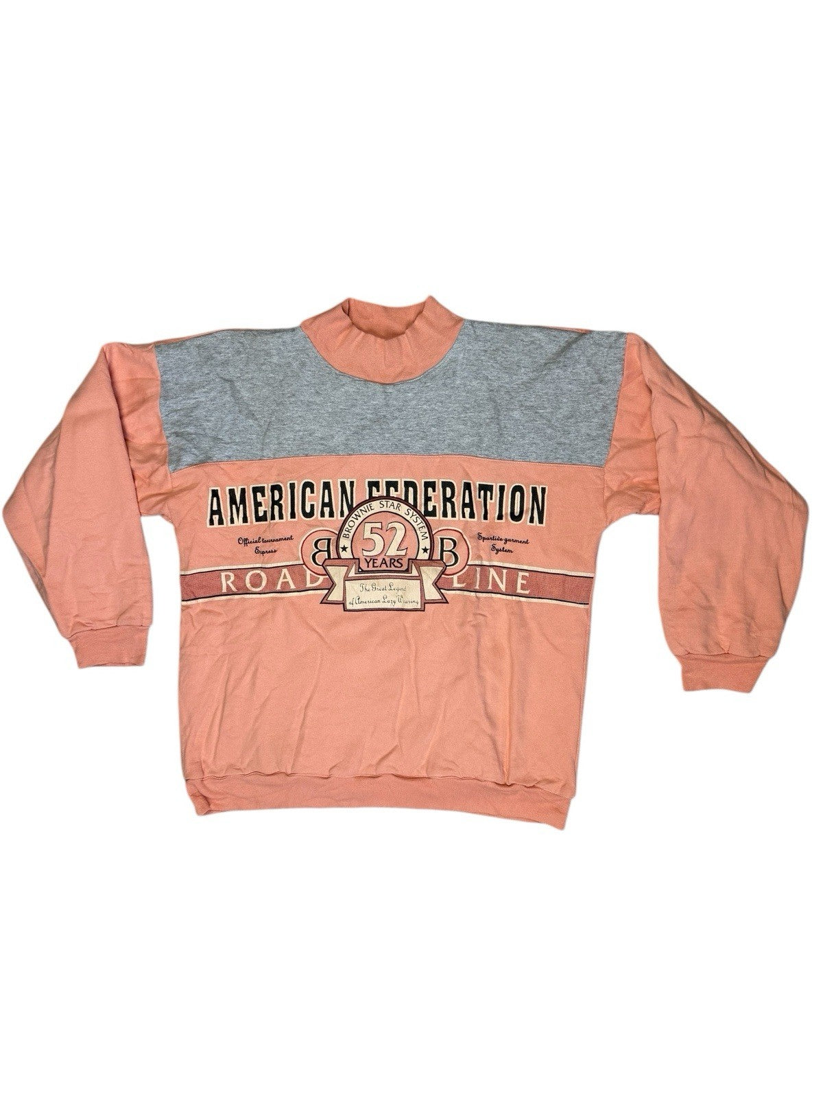 Vintage americana peach pink with grey trim American Federation, brownie star system printed graphic lined sweatshirt pullover jumper, cuffed turtleneck style collar, sleeves and hem